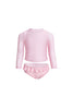 This charming two-piece features a soft pink base sprinkled with tiny white hearts - a delicate and playful design perfect for sunny days. The long-sleeved top offers extra sun protection, while the bikini-style bottoms feature a gentle frill at the hips for added sweetness.