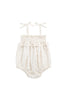 The Cleo Playsuit – Aries Mauve is a sweet and playful one-piece, featuring a soft floral print on a light base. With adjustable shoulder ties, a ruffled bodice, and elasticated leg openings, this playsuit is designed for comfort and charm—perfect for warm days or layering with a cardigan.